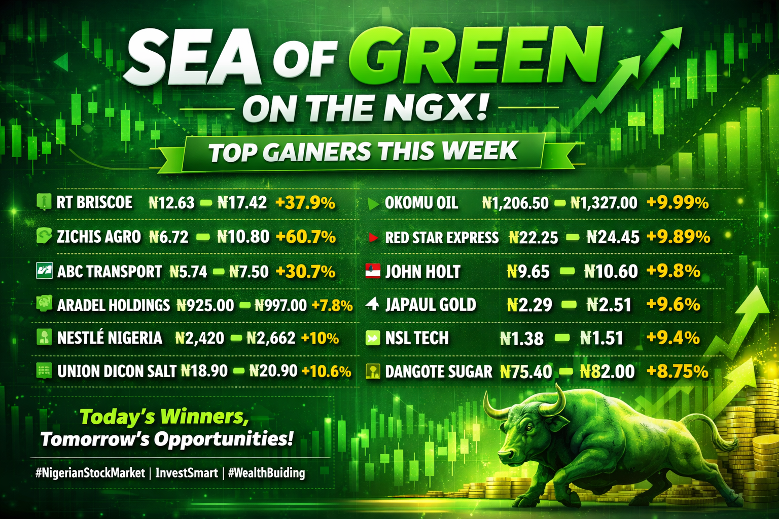 🔥 SEA OF GREEN ON THE NGX THIS WEEK! 📈 The market closed the week on a strong bullish note, with several stocks hitting impressive gains from Monday’s opening bell to Friday’s close. Investors who positioned early definitely had something to smile about. Here’s a quick look at how some of the top performers moved: 1️⃣ RT Briscoe (RTBRISCOE) ₦12.63 ➡ ₦17.42 | 🔼 +37.9% 2️⃣ Zichis Agro Allied (ZICHIS) ₦6.72 ➡ ₦10.80 | 🔼 +60.7% 3️⃣ ABC Transport (ABCTRAN) ₦5.74 ➡ ₦7.50 | 🔼 +30.7% 4️⃣ Aradel Holdings (ARADEL) ₦925.00 ➡ ₦997.00 | 🔼 +7.8% 5️⃣ Nestlé Nigeria (NESTLE) ₦2,420.00 ➡ ₦2,662.00 | 🔼 +10.0% 6️⃣ Union Dicon Salt (UNIONDICON) ₦18.90 ➡ ₦20.90 | 🔼 +10.6% 7️⃣ Infinity Trust Mortgage Bank (INFINITY) ₦9.00 ➡ ₦9.90 | 🔼 +10.0% 8️⃣ McNichols Plc (MCNICHO) ₦7.00 ➡ ₦7.70 | 🔼 +10.0% 9️⃣ Cornerstone Insurance Plc (CORNERST) ₦5.80 ➡ ₦6.38 | 🔼 +10.0% 🔟 Okomu Oil Palm Company (OKOMUOIL) ₦1,206.50 ➡ ₦1,327.00 | 🔼 +9.99% 1️⃣1️⃣ Red Star Express (REDSTAREX) ₦22.25 ➡ ₦24.45 | 🔼 +9.89% 1️⃣2️⃣ John Holt Plc (JOHNHOLT) ₦9.65 ➡ ₦10.60 | 🔼 +9.84% 1️⃣3️⃣ Japaul Gold & Ventures (JAPAULGOLD) ₦2.29 ➡ ₦2.51 | 🔼 +9.61% 1️⃣4️⃣ Secure Electronic Technology Plc (NSLTECH) ₦1.38 ➡ ₦1.51 | 🔼 +9.42% 1️⃣5️⃣ Dangote Sugar Refinery (DANGSUGAR) ₦75.40 ➡ ₦82.00 | 🔼 +8.75% 💡 Reminder: Today’s top gainers can become next week’s pullbacks. The stock market rewards strategy, patience, and proper risk management — not emotions. 📊 Are you holding any of these stocks? Which one surprised you the most this week? #NigerianStockMarket #NGX #Investing #WealthBuilding