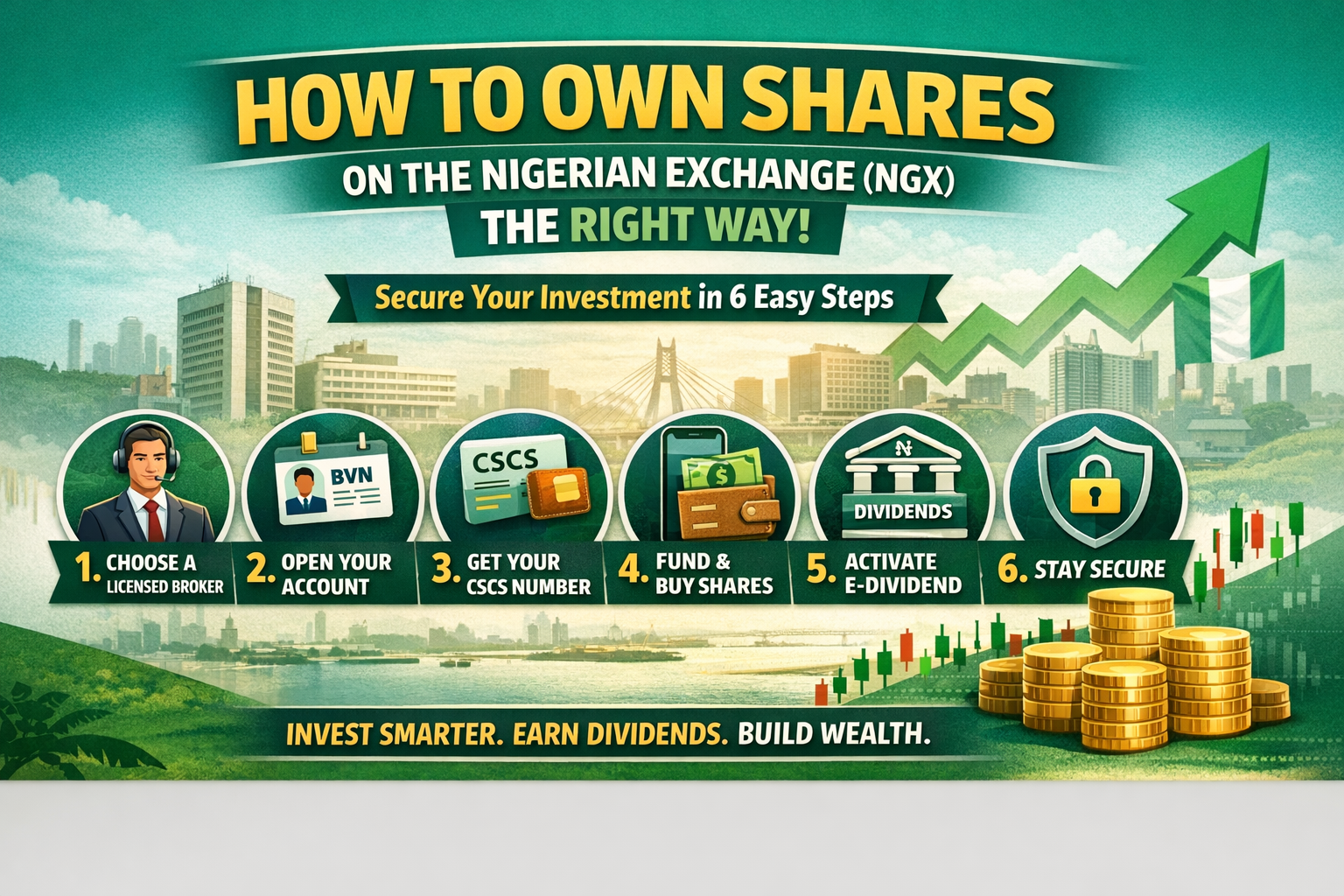 📈 How to LEGALLY Own Shares on the Nigerian Exchange (NGX) – The Right Way! If you’ve ever wondered: “How do I truly own shares in Nigeria?” “How do I confirm that the shares are really mine?” “Is it paper or digital?” This is your simple, practical guide to getting started the correct way — without confusion or scams. ✅ Step 1: Choose a Licensed Stockbroker To buy shares on the Nigerian Exchange, you must go through a registered stockbroker. Why this is important: Licensed brokers are officially connected to the exchange and the clearing system that records ownership. If a platform isn’t licensed, your money is at risk. Some well-known brokers in Nigeria include: Bamboo (mobile-focused and beginner-friendly) Chapel Hill Denham (via InvestNaija) Stanbic IBTC Securities Afrinvest ARM Securities 👉 Always confirm the broker is licensed by the SEC and listed on the Nigerian Exchange before proceeding. ✅ Step 2: Open Your Trading Account Most brokers allow you to register online within minutes. You’ll typically need: Your full name (must match your BVN exactly) Valid ID (NIN, International Passport, etc.) A functional bank account Your BVN ⚠️ Important: Make sure all your details match across documents to avoid future delays. ✅ Step 3: Get Your CSCS Account (Your Real Proof of Ownership) After registration, your broker will open or link you to a CSCS account. The Central Securities Clearing System (CSCS) is the official digital system that records who owns shares in Nigeria. This is your real proof — not paper certificates. You’ll receive: Your CSCS number Your CHN (Clearing House Number) Keep these safe. They confirm that the shares legally belong to you. ✅ Step 4: Fund Your Brokerage Wallet Transfer money from your bank into your broker’s wallet inside the app. If you’re new, start small — even ₦5,000 to ₦50,000 is enough to begin learning. Investing is a skill. Start small, grow with confidence. ✅ Step 5: Buy Your First Shares Inside the app: Search for a company Enter how many shares you want Confirm your order You can buy shares of companies like: Dangote Cement BUA Foods Okomu Oil Palm Company MTN Nigeria Guaranty Trust Holding Company After purchase, it may take a short settlement period before the shares fully reflect in your portfolio. ✅ Step 6: Activate E-Dividend This is very important. When companies declare dividends, the money will be paid directly into your bank account — automatically. No chasing registrars. No paper warrants. No stress. 🚨 Avoid These Costly Mistakes ❌ Don’t deal with unlicensed “agents” ❌ Don’t share your BVN PIN or banking password ❌ Don’t fall for “get rich quick” promises ❌ Don’t accept paper certificates from unknown sources Everything is digital now. 💡 Frequently Asked Questions What happens when dividends are paid? If you own the shares before the qualification date, the dividend is credited directly to your bank (once e-dividend is activated). What’s the minimum amount to start? Many platforms allow you to start from as low as ₦5,000. How do I confirm my shares? Check your broker’s app or request a CSCS statement for independent confirmation. Owning shares means owning a piece of real companies. Stop watching others build wealth. Take your first step today and become a shareholder. 📌 Knowledge is power. Action builds wealth.