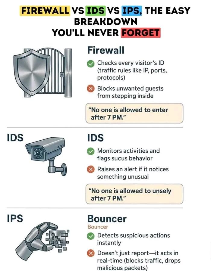 Firewall vs IDS vs IPS: Easy to Understand Firewall: Think of a firewall like a gatekeeper. It checks everyone trying to enter and stops anyone who shouldn’t be there. "No entry after 7 PM." IDS (Intrusion Detection System): IDS is like a security camera. It watches for suspicious activity and sends an alert if something’s wrong. "No weird behavior after 7 PM." IPS (Intrusion Prevention System): IPS is like a bouncer. It not only sees trouble but also stops it right away, blocking bad traffic. "I don’t just watch; I stop the troublemakers." #CyberSecurity #Firewall #IDS #IPS #StaySafe #TechBasics #fblifestyle