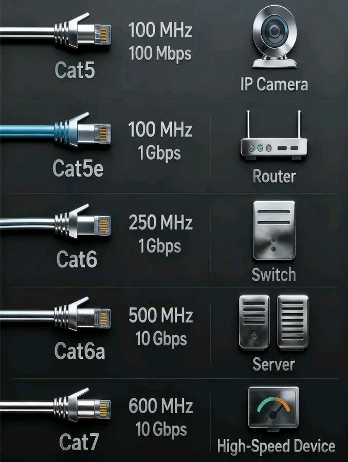 Ethernet Cable Categories Did you know your network performance is determined by the type of Ethernet cable you use? Check out these common Ethernet cables and what they offer: • Cat5: 100 MHz | 100 Mbps Ideal for basic devices like IP Cameras. • Cat5e: 100 MHz | 1 Gbps Perfect for devices like a Router, providing faster speeds. • Cat6: 250 MHz | 1 Gbps A reliable choice for connecting your Switch. • Cat6a: 500 MHz | 10 Gbps For high-performance Servers and large data transfer. • Cat7: 600 MHz | 10 Gbps The fastest cable for High-Speed Devices, supporting 10 Gbps speeds. Choosing the right cable can make a huge difference in your internet speed and overall network experience! #TechTips #Networking #EthernetCables #fblifestyle
