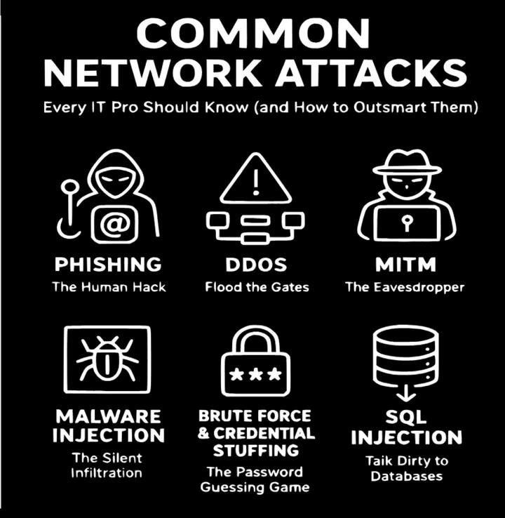 Common Network Attacks & How to Stay Safe 🚨 1. Phishing: Trickery to steal info. 🛡️ Stay safe: Verify email sources & don’t click on suspicious links. 2. DDoS: Overload your website with traffic. 🛡️ Stay safe: Use DDoS protection & ensure network resources are adequate. 3. MITM: Intercepted communications. 🛡️ Stay safe: Use HTTPS, avoid public Wi-Fi, and encrypt with a VPN. 4. Malware Injection: Silent infiltration of harmful software. 🛡️ Stay safe: Keep antivirus updated & avoid untrusted downloads. 5. Brute Force & Credential Stuffing: Guessing passwords. 🛡️ Stay safe: Use strong, unique passwords & enable 2FA. 6. SQL Injection: Manipulating databases. 🛡️ Stay safe: Use secure coding practices and validate input fields. Stay vigilant and protect your network! 🔐💻 #Cybersecurity #StaySafe #fblifestyle