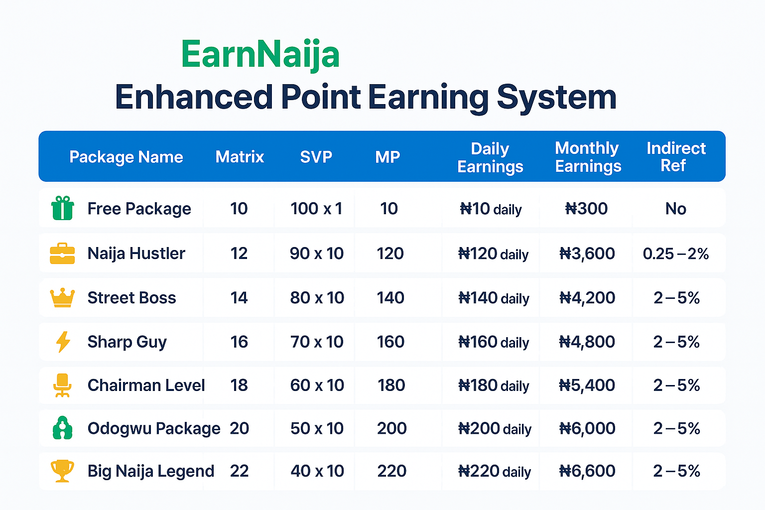 EarnNaija is designed to be inclusive (Free Package), scalable (Hustler → Legend), and reward-driven. Whether you want to earn passively daily or maximize referrals, there’s a package built for you.